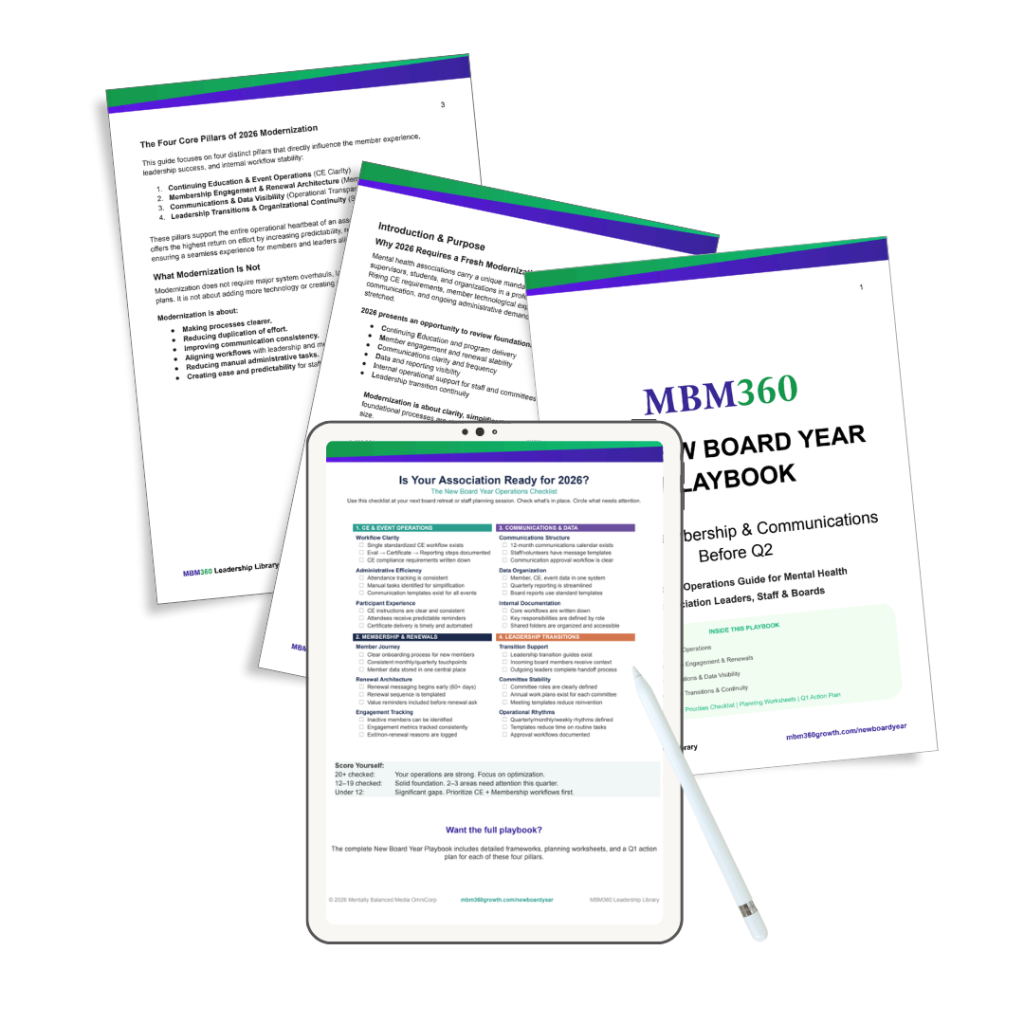 MBM360 is the only Operating System built specifically for mental and behavioral health professional associations — combining governed infrastructure and outsourced Operations Departments.